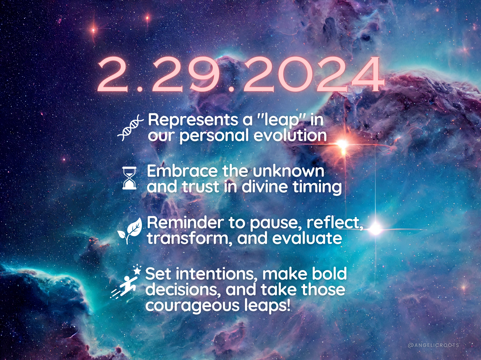 Leap years serve as a reminder for us to pause, reflect, and evaluate our lives. It offers an opportunity for introspection and self-discovery. This additional day can be seen as a gift, allowing us to make leaps in our personal growth and spiritual development. The energy is ripe for transformation and change! Leap year energy is perfect to set intentions, make bold decisions, and take courageous actions. It supports us as we break free from old patterns and embrace new possibilities.