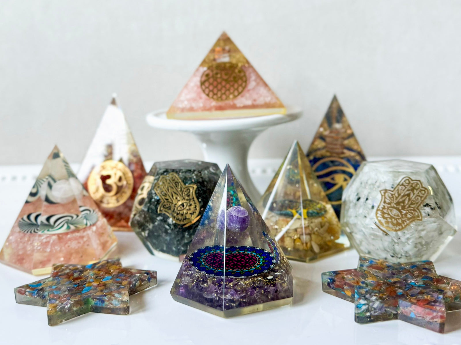 Orgone-generating devices, such as Orgone pyramids, wands, pendants, points, and pendulums can be used to enhance Universal energy and mitigate electromagnetic frequencies (EMF). EMF is a type of electromagnetic radiation emitted from electronic devices. We are increasingly saturated with EMF from electronic devices such as smartphones, computers, Wi-Fi routers, among many others. The Orgone devices are composed of a mix of copper metal shavings, gemstone chips, and epoxy resin. This results in a highly efficient energy transmutation tool. Negative energy is absorbed and transmuted into positive energy while emanating the energy of a set intention.