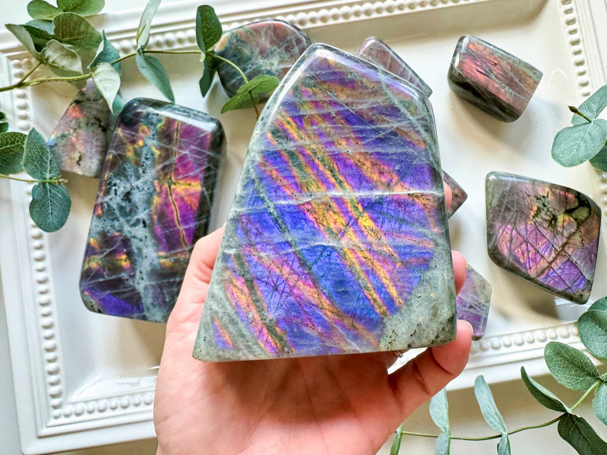 One of our favorite minerals is Labradorite! We love it for its magical flash and its ability to awaken our inner awareness and illuminate our intuition. It's also one of the most requested crystals in our shop! Each piece is absolutely beautiful and unique, featuring a stunning array of colors and vibrant chatoyancy!